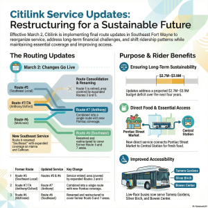 Beginning Monday, March 2, Citilink will implement service updates affecting parts of Southeast Fort Wayne. These changes are now final and reflect months of analysis, rider input, and careful consideration of how to best provide reliable transit in a challenging funding environment.