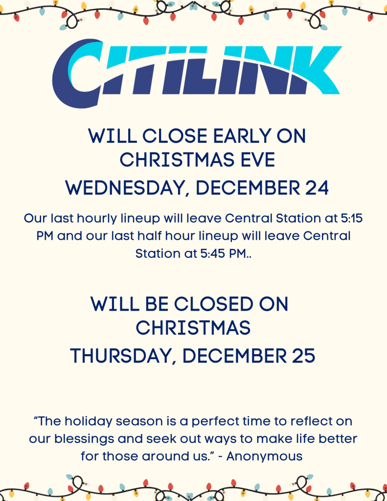 Citilink Will Close Early Christmas Eve and Be Closed on Christmas Day