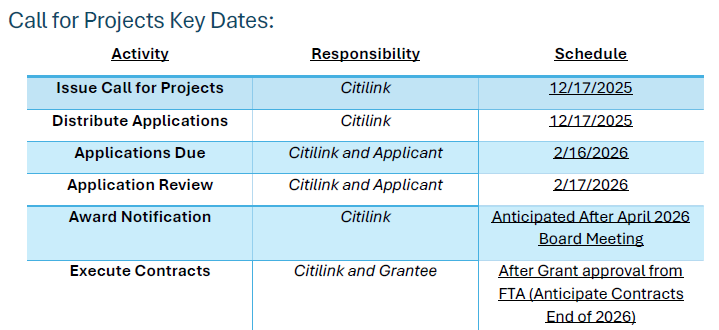The Section 5310 enhanced Mobility of Seniors and Individuals with Disabilities Program is a federal program that aims to improve mobility for seniors and individuals with disabilities by removing barriers to transportation and expanding transportation options. Applicants are required to provide accurate cost estimates for the project(s) and demonstrate the ability to fund the project(s) at the time of application submittal operating projects must be able to document the ability to provide 50% of the total project cost as local match (applicant funds), and capital projects must be able to document the ability to provide 20% of the total project cost as local match (applicant funds). Please visit Citilink’s website at www.fwcitilink.com to access the Call for Projects and all associated documents. $437,565 in federal funds are available for all projects with $240,661 in capital funding and $153,148 in operational funding available to applicants. The remaining $43,756 will be used to fund the program administration (Citilink’s administration of this program).